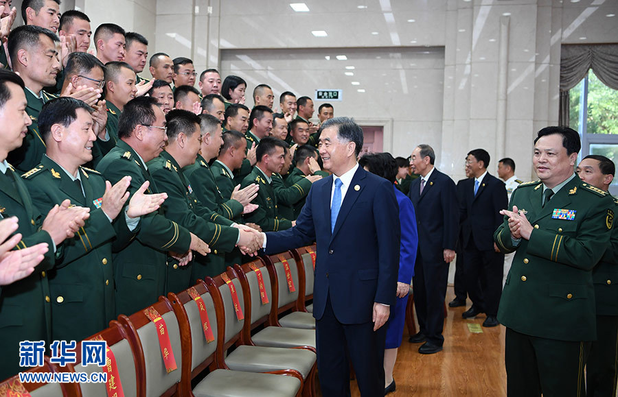 9月19日,中共中央政治局常委、全國(guó)政協(xié)主席、中央代表團(tuán)團(tuán)長(zhǎng)汪洋率代表團(tuán)部分成員分別赴寧夏軍區(qū)、武警寧夏總隊(duì)慰問(wèn),并會(huì)見(jiàn)自治區(qū)政法系統(tǒng)代表。這是汪洋慰問(wèn)武警寧夏總隊(duì)官兵代表。 新華社記者 張領(lǐng) 攝