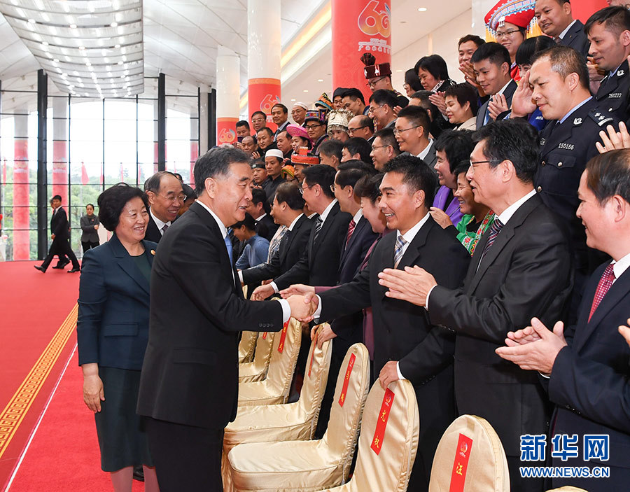 南寧荔園山莊會見廳內(nèi),圍欄上懸掛著鮮艷的紅綢帶,印有廣西壯族自治區(qū)成立60周年慶祝活動徽標的立柱高高聳立,簡樸莊重的大廳洋溢著喜慶祥和的氣氛。汪洋等走上前去與大家親切握手,并代表中央代表團向他們表示問候。