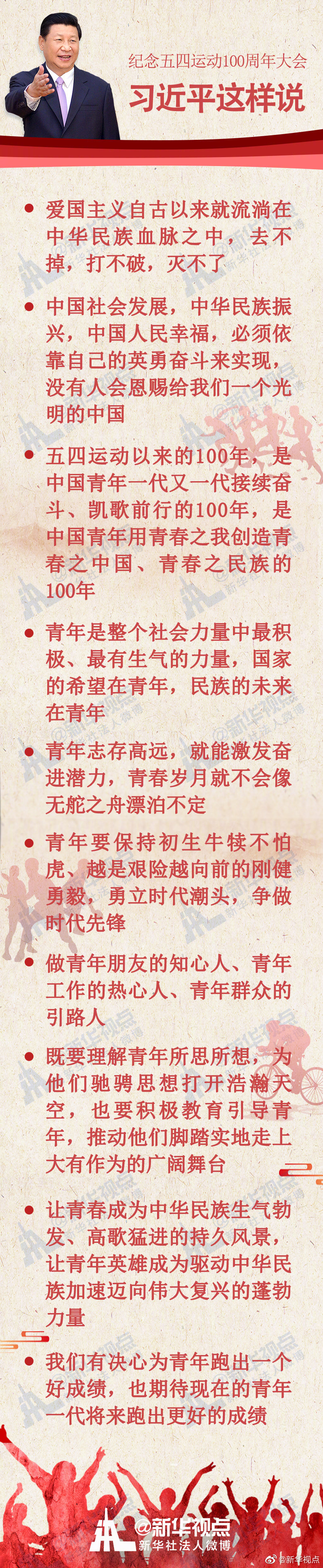 紀念五四運動100周年大會今天上午在北京人民大會堂隆重舉行,中共中央總書記、國家主席、中央軍委主席習近平出席大會并發(fā)表重要講話。戳圖看金句↓ ????