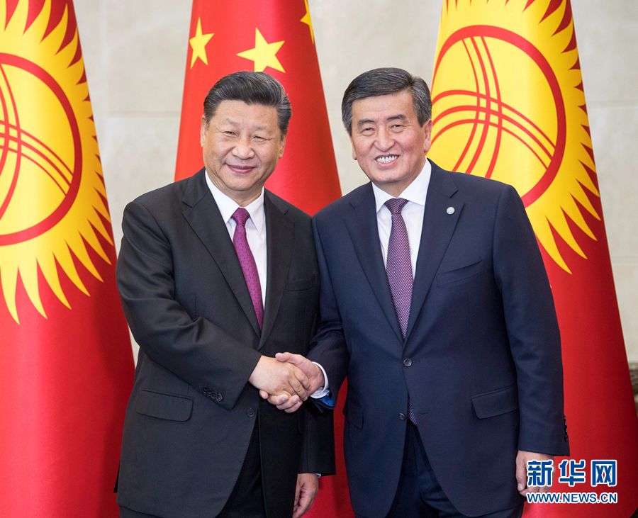 6月13日,國家主席習(xí)近平在比什凱克同吉爾吉斯斯坦總統(tǒng)熱恩別科夫會談。這是會談結(jié)束后,兩國元首共同會見記者。 新華社記者 殷博古 攝