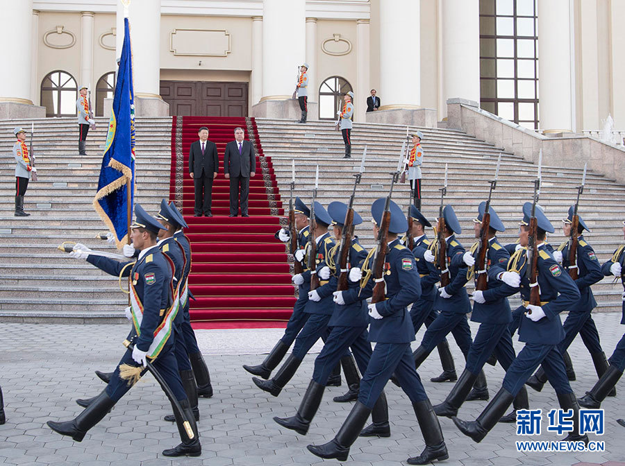 會談前,拉赫蒙在總統(tǒng)府前廣場為習近平舉行了盛大歡迎儀式。