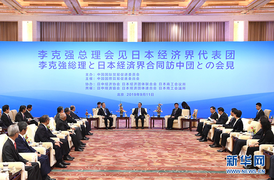 新華社北京9月11日電(記者朱超)國務院總理李克強11日下午在釣魚臺國賓館會見日中經(jīng)濟協(xié)會會長宗岡正二、日本商工會議所會長三村明夫、日本經(jīng)濟團體聯(lián)合會審議員會議長古賀信行率領的日本經(jīng)濟界代表團并同他們座談交流。日本主要企業(yè)負責人200余人出席。
