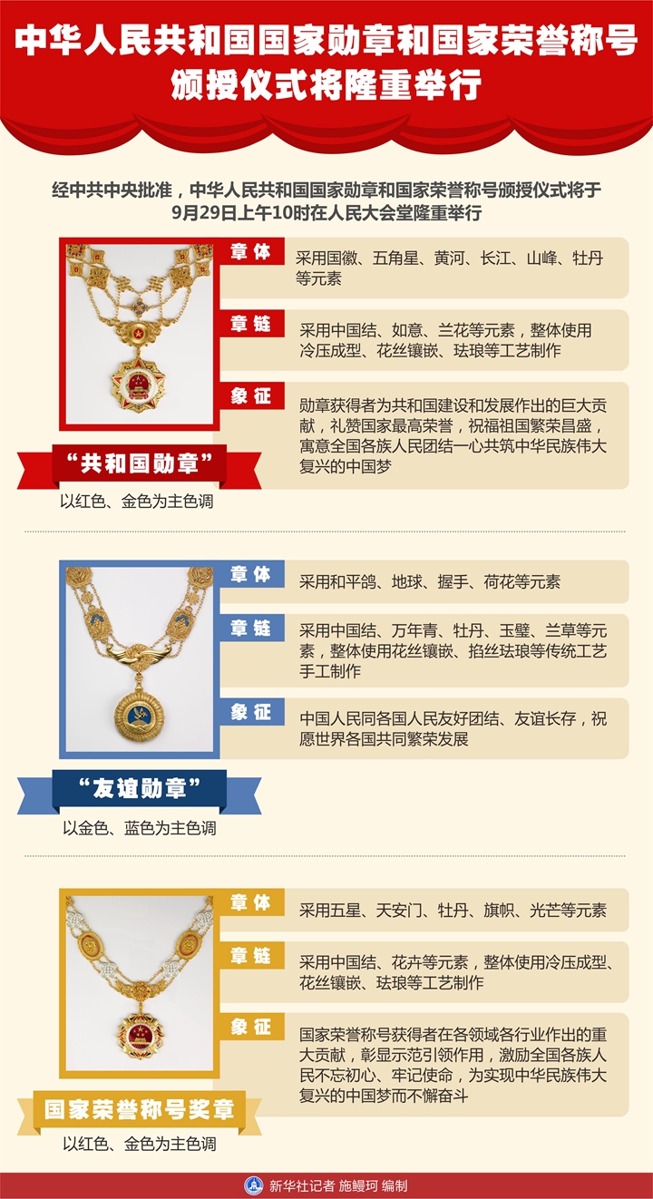 經(jīng)中共中央批準(zhǔn),中華人民共和國國家勛章和國家榮譽(yù)稱號頒授儀式將于9月29日上午10時(shí)在北京人民大會(huì)堂隆重舉行。 這是“友誼勛章”。 新華社發(fā)