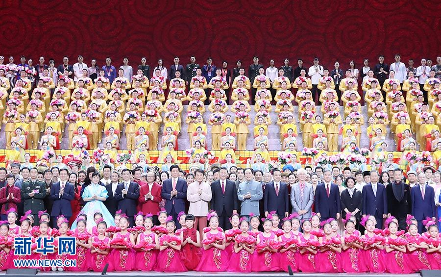 9月29日,慶祝中華人民共和國成立70周年大型文藝晚會(huì)《奮斗吧 中華兒女》在北京人民大會(huì)堂舉行。習(xí)近平、李克強(qiáng)、栗戰(zhàn)書、汪洋、王滬寧、趙樂際、韓正、王岐山等黨和國家領(lǐng)導(dǎo)人同4000多名觀眾一起觀看演出。演出結(jié)束后,習(xí)近平等走上舞臺(tái)同演職人員合影留念。 新華社記者 王曄 攝