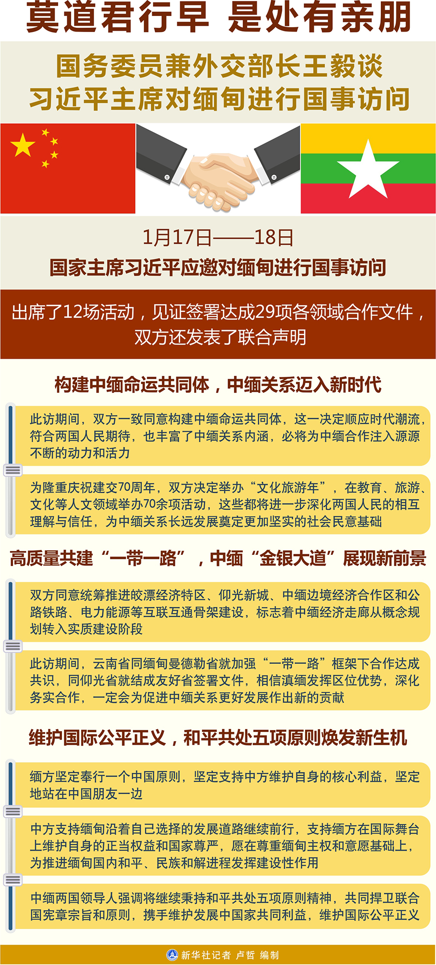 新華社內(nèi)比都1月18日電? 1月17日至18日,國家主席習近平應邀對緬甸進行國事訪問。行程結(jié)束之際,國務委員兼外交部長王毅向隨行記者介紹此訪情況。