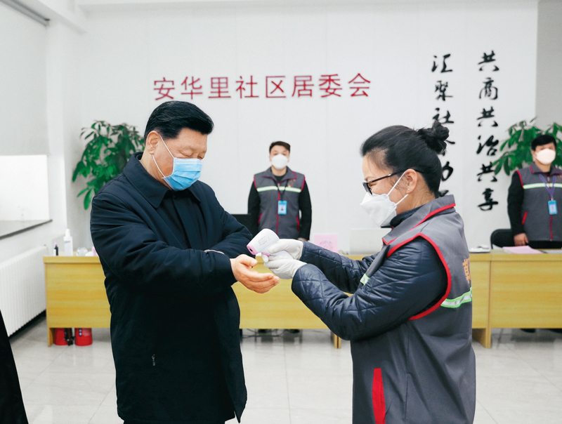 2020年2月10日,中共中央總書記、國家主席、中央軍委主席習(xí)近平在北京調(diào)研指導(dǎo)新冠肺炎疫情防控工作。這是習(xí)近平來到朝陽區(qū)安貞街道安華里社區(qū),了解基層一線疫情聯(lián)防聯(lián)控情況。 新華社記者 鞠鵬/攝