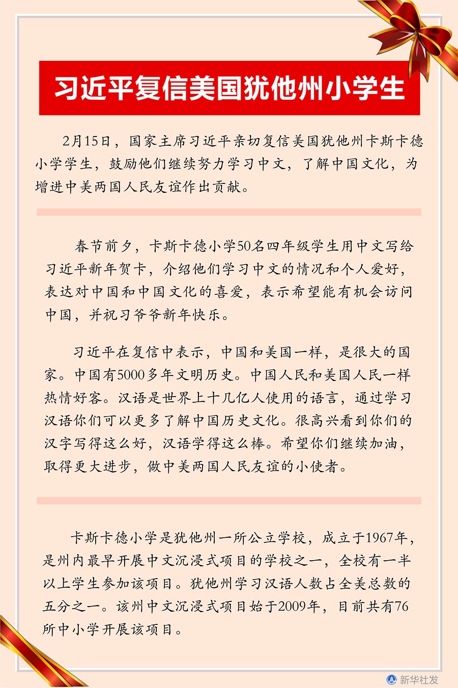 新華社北京2月22日電? 2月15日,國家主席習(xí)近平親切復(fù)信美國猶他州卡斯卡德小學(xué)學(xué)生,鼓勵他們繼續(xù)努力學(xué)習(xí)中文,了解中國文化,為增進中美兩國人民友誼作出貢獻。