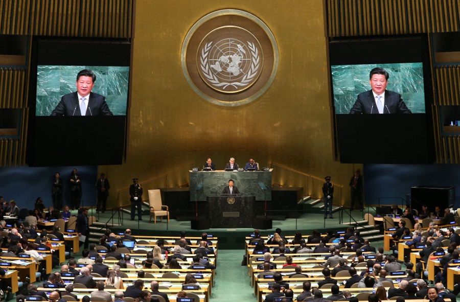 2015年9月28日,國家主席習近平在紐約聯(lián)合國總部出席第70屆聯(lián)合國大會一般性辯論并發(fā)表題為《攜手構建合作共贏新伙伴 同心打造人類命運共同體》的重要講話。新華社記者龐興雷攝