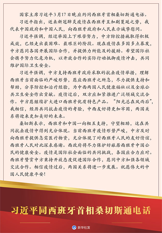 習(xí)近平強調(diào),中方支持西班牙政府采取的抗擊疫情舉措,理解西班牙當(dāng)前面臨的嚴(yán)峻形勢,愿應(yīng)西班牙之所急,盡力提供支持和幫助,分享防控和治療經(jīng)驗,為中西兩國人民健康福祉以及全球公共衛(wèi)生安全作出貢獻(xiàn)。疫情過后,雙方應(yīng)加緊推進(jìn)廣泛領(lǐng)域交流合作。中方愿繼續(xù)擴(kuò)大進(jìn)口西班牙優(yōu)質(zhì)特色產(chǎn)品?!瓣柟饪傇陲L(fēng)雨后”,我相信,經(jīng)歷共同抗擊疫情的考驗,中西友好將更加牢固,兩國關(guān)系將迎來更加美好的未來。