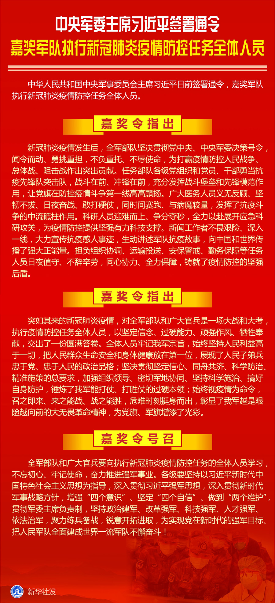 嘉獎(jiǎng)令指出,突如其來(lái)的新冠肺炎疫情,對(duì)全軍部隊(duì)和廣大官兵是一場(chǎng)大戰(zhàn)和大考,執(zhí)行疫情防控任務(wù)全體人員,以堅(jiān)定信念、過(guò)硬能力、頑強(qiáng)作風(fēng)、犧牲奉獻(xiàn),交出了一份圓滿答卷。全體人員牢記我軍宗旨,始終堅(jiān)持人民利益高于一切,把人民群眾生命安全和身體健康放在第一位,展現(xiàn)了人民子弟兵忠于黨、忠于人民的政治品格;堅(jiān)決貫徹堅(jiān)定信心、同舟共濟(jì)、科學(xué)防治、精準(zhǔn)施策的總要求,加強(qiáng)組織領(lǐng)導(dǎo)、密切軍地協(xié)同、堅(jiān)持科學(xué)施治、搞好自身防護(hù),錘煉了我軍能打仗、打勝仗的過(guò)硬本領(lǐng);始終視疫情為命令,召之即來(lái)、來(lái)之能戰(zhàn)、戰(zhàn)之能勝,危難時(shí)刻挺身而出,彰顯了我軍越是艱險(xiǎn)越向前的大無(wú)畏革命精神,為黨旗、軍旗增添了光彩。