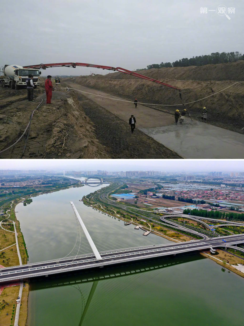 ?↑拼版照片:上圖為2017年10月5日拍攝的太原市汾河城區(qū)段治理美化三期工程施工場(chǎng)景(資料照片);下圖為2020年4月29日無(wú)人機(jī)拍攝的太原市汾河兩岸景色(新華社記者 曹陽(yáng) 攝)。