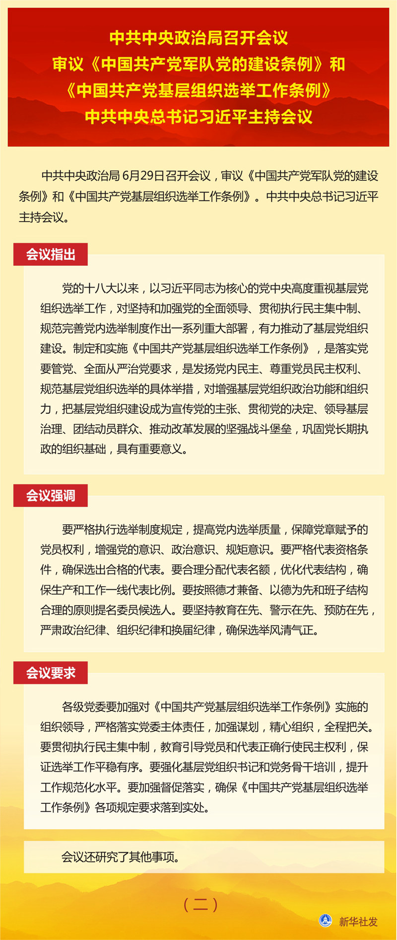 新華社北京6月29日電? 中共中央政治局6月29日召開會議,審議《中國共產(chǎn)黨軍隊黨的建設(shè)條例》和《中國共產(chǎn)黨基層組織選舉工作條例》。中共中央總書記習(xí)近平主持會議。