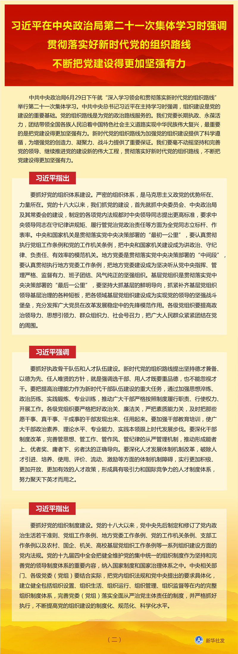 新華社北京6月30日電 中共中央政治局6月29日下午就“深入學習領會和貫徹落實新時代黨的組織路線”舉行第二十一次集體學習。中共中央總書記習近平在主持學習時強調(diào),組織建設是黨的建設的重要基礎。黨的組織路線是為黨的政治路線服務的。我們黨要長期執(zhí)政、永葆活力,團結(jié)帶領全國各族人民沿著中國特色社會主義道路實現(xiàn)中華民族偉大復興,最重要的是把黨建設得更加堅強有力。新時代黨的組織路線為加強黨的組織建設提供了科學遵循,為增強黨的創(chuàng)造力、凝聚力、戰(zhàn)斗力提供了重要保證。我們要毫不動搖堅持和完善黨的領導、繼續(xù)推進黨的建設新的偉大工程,貫徹落實好新時代黨的組織路線,不斷把黨建設得更加堅強有力。