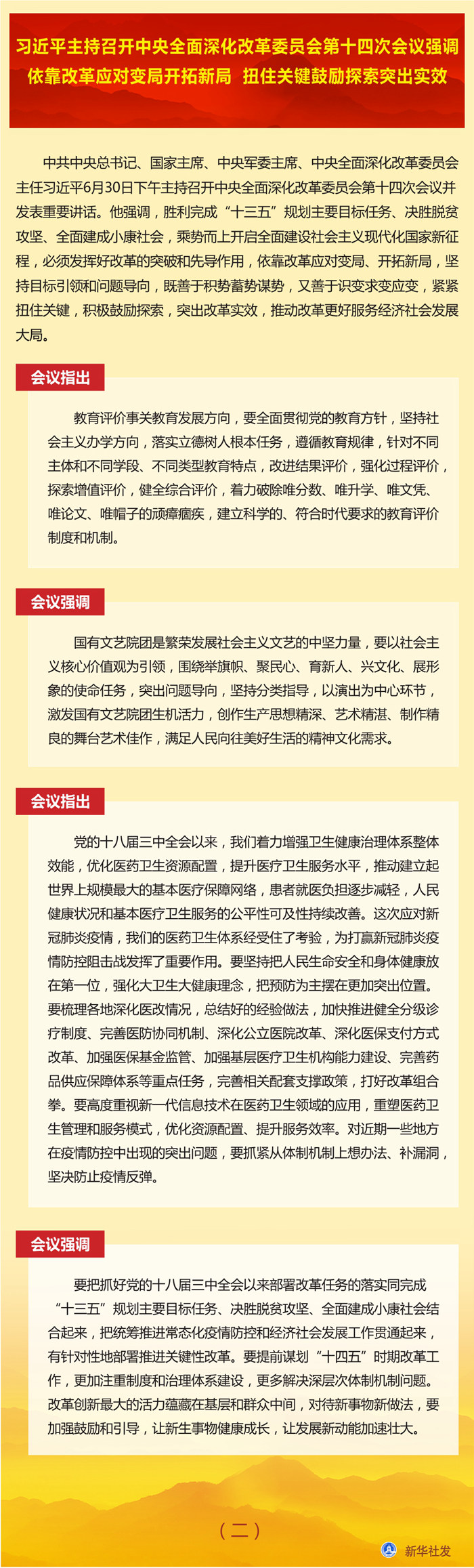 新華社北京6月30日電? 中共中央總書記、國(guó)家主席、中央軍委主席、中央全面深化改革委員會(huì)主任習(xí)近平6月30日下午主持召開中央全面深化改革委員會(huì)第十四次會(huì)議并發(fā)表重要講話。他強(qiáng)調(diào),勝利完成“十三五”規(guī)劃主要目標(biāo)任務(wù)、決勝脫貧攻堅(jiān)、全面建成小康社會(huì),乘勢(shì)而上開啟全面建設(shè)社會(huì)主義現(xiàn)代化國(guó)家新征程,必須發(fā)揮好改革的突破和先導(dǎo)作用,依靠改革應(yīng)對(duì)變局、開拓新局,堅(jiān)持目標(biāo)引領(lǐng)和問題導(dǎo)向,既善于積勢(shì)蓄勢(shì)謀勢(shì),又善于識(shí)變求變應(yīng)變,緊緊扭住關(guān)鍵,積極鼓勵(lì)探索,突出改革實(shí)效,推動(dòng)改革更好服務(wù)經(jīng)濟(jì)社會(huì)發(fā)展大局。