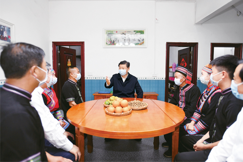 2020年9月16日至18日,中共中央總書記、國家主席、中央軍委主席習近平在湖南考察。這是16日下午,在郴州市汝城縣文明瑤族鄉(xiāng)沙洲瑤族村,習近平同村民朱小紅一家拉家常。 新華社記者 謝環(huán)馳/攝