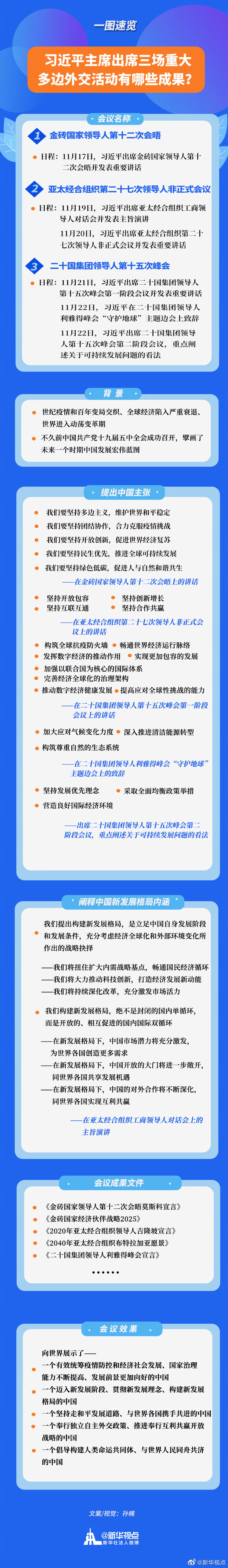 11月17日至22日,國(guó)家主席習(xí)近平接連出席金磚國(guó)家領(lǐng)導(dǎo)人第十二次會(huì)晤、亞太經(jīng)合組織第二十七次領(lǐng)導(dǎo)人非正式會(huì)議、二十國(guó)集團(tuán)領(lǐng)導(dǎo)人第十五次峰會(huì)三場(chǎng)重大多邊外交活動(dòng),并發(fā)表一系列重要講話(huà)。習(xí)主席的講話(huà)有哪些要點(diǎn)?提出了哪些中國(guó)主張?是如何闡釋中國(guó)新發(fā)展格局內(nèi)涵的?戳圖速覽↓