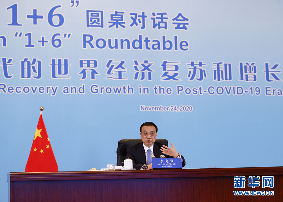 11月24日晚,國務(wù)院總理李克強(qiáng)在北京釣魚臺國賓館同世界銀行行長馬爾帕斯、國際貨幣基金組織總裁格奧爾基耶娃、世界貿(mào)易組織副總干事沃爾夫、國際勞工組織總干事賴德、經(jīng)濟(jì)合作與發(fā)展組織秘書長古里亞和金融穩(wěn)定理事會主席夸爾斯舉行第五次“1+6”圓桌對話會。會議以視頻方式舉行。新華社記者 黃敬文 攝