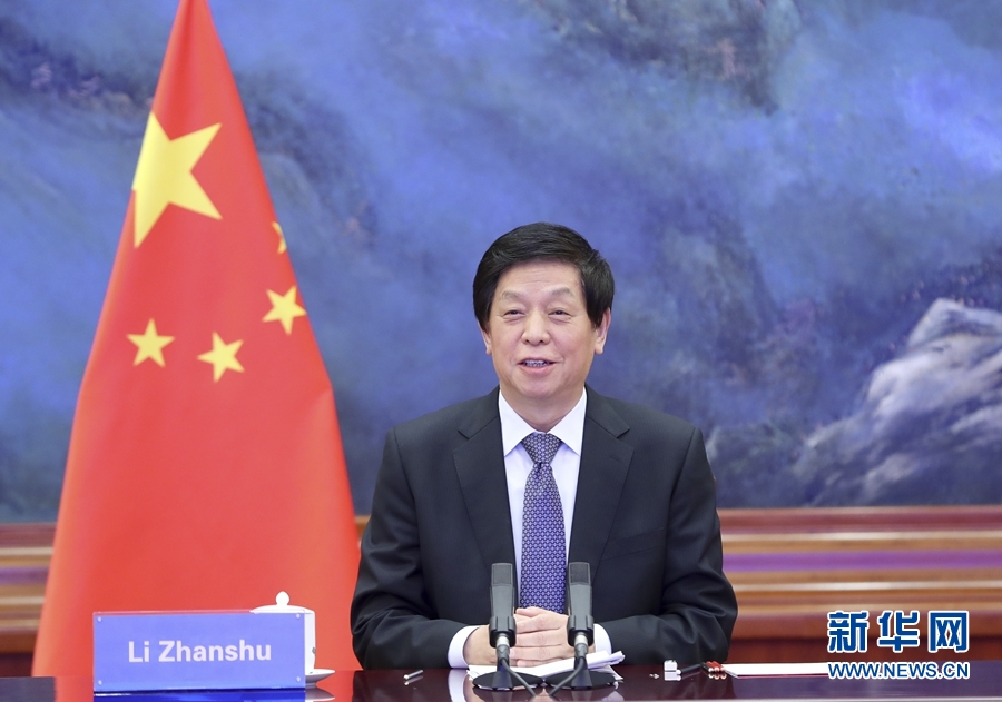 12月15日,全國(guó)人大常委會(huì)委員長(zhǎng)栗戰(zhàn)書(shū)在北京人民大會(huì)堂以視頻方式同日本眾議長(zhǎng)大島理森舉行會(huì)談。新華社記者 丁海濤 攝