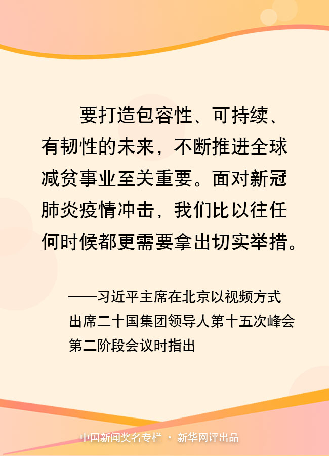 11月22日晚,習(xí)近平主席在北京以視頻方式出席二十國集團(tuán)領(lǐng)導(dǎo)人第十五次峰會(huì)第二階段會(huì)議,重點(diǎn)闡述關(guān)于可持續(xù)發(fā)展問題的看法。他指出,要打造包容性、可持續(xù)、有韌性的未來,不斷推進(jìn)全球減貧事業(yè)至關(guān)重要。面對(duì)新冠肺炎疫情沖擊,我們比以往任何時(shí)候都更需要拿出切實(shí)舉措。
