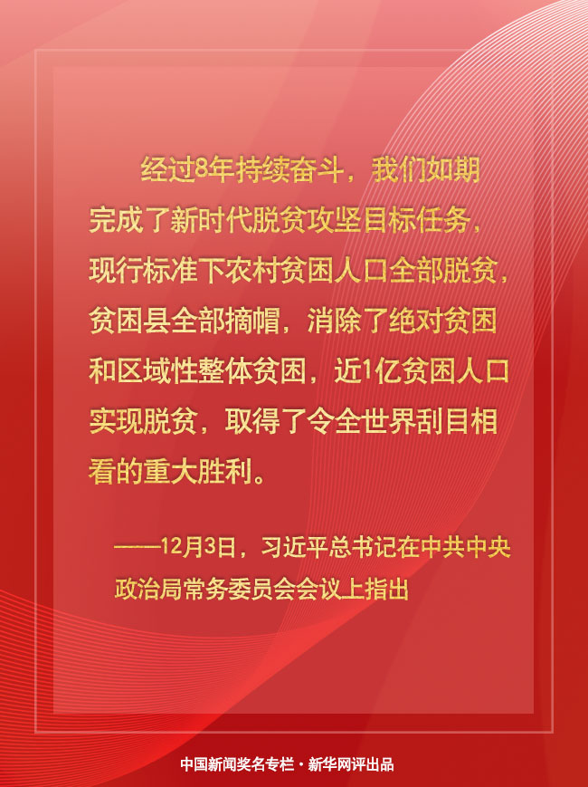 中共中央政治局常務委員會12月3日召開會議,聽取脫貧攻堅總結評估匯報。習近平總書記在會上指出,經過8年持續(xù)奮斗,我們如期完成了新時代脫貧攻堅目標任務,現行標準下農村貧困人口全部脫貧,貧困縣全部摘帽,消除了絕對貧困和區(qū)域性整體貧困,近1億貧困人口實現脫貧,取得了令全世界刮目相看的重大勝利。