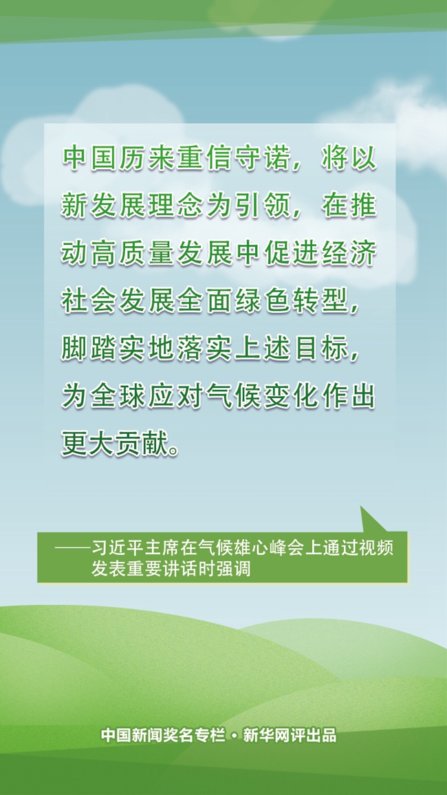 12月12日,國家主席習(xí)近平在氣候雄心峰會(huì)上通過視頻發(fā)表重要講話,闡釋應(yīng)對氣候變化的中國主張,宣布中國國家自主貢獻(xiàn)最新舉措,為全球氣候治理提振雄心并提供新思路,彰顯中國與世界各國攜手助力《巴黎協(xié)定》行穩(wěn)致遠(yuǎn)的決心,展現(xiàn)了中國重信守諾、為全球應(yīng)對氣候變化作出更大貢獻(xiàn)的大國擔(dān)當(dāng)。