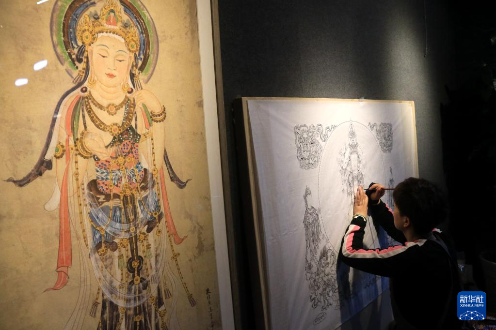 2月22日,在敦煌小镇鸣沙书院,来自陕西的学员吴恩梵学习敦煌壁画临摹技艺。