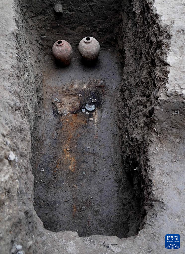这是宋国故城遗址内的唐代墓葬出土的陶罐(3月25日摄)。