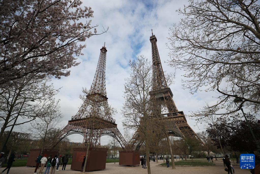 这是4月3日在法国巴黎拍摄的埃菲尔铁塔(右)和“小埃菲尔铁塔”。