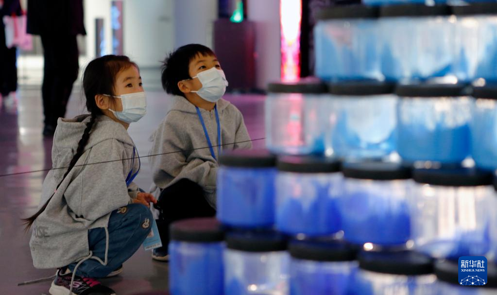 4月15日,小朋友在“2023第六届苏州·金鸡湖双年展”上参观。
