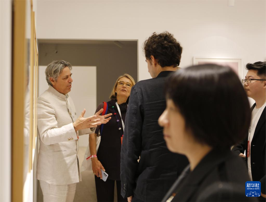 4月15日,受邀嘉宾在“2023第六届苏州·金鸡湖双年展”上参观、讨论艺术作品。