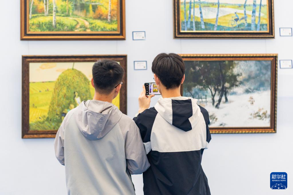 5月7日,在哈尔滨国际会展体育中心,观众在首届东北亚文化艺术创意设计博览会上参观拍照。