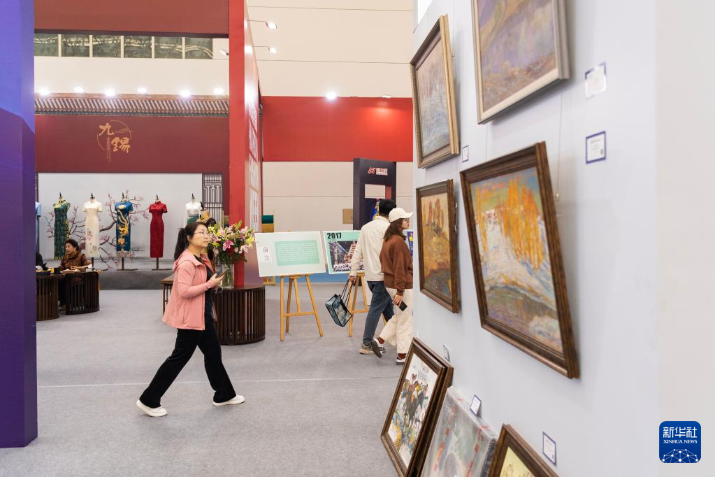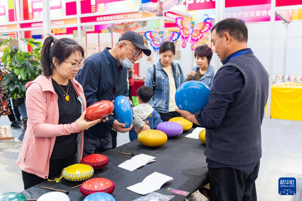 5月7日,在哈尔滨国际会展体育中心,观众在首届东北亚文化艺术创意设计博览会上参观选购。