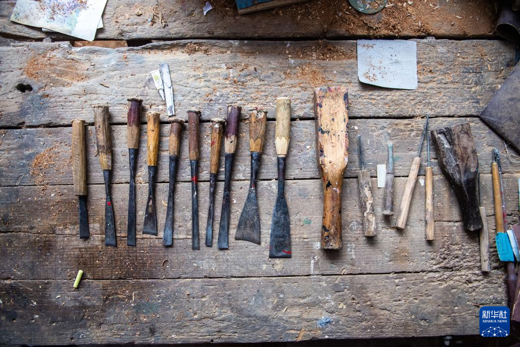 这是5月23日在洞口县岩山镇阳家山村拍摄的制作洞口木雕的工具。
