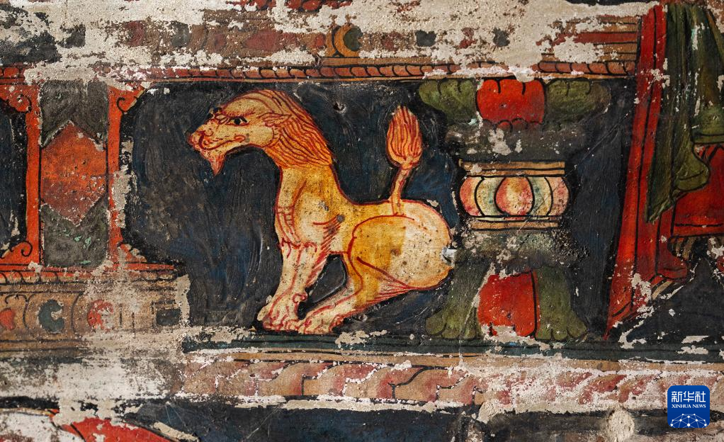 这是5月26日拍摄的皮央石窟壁画中的狮子像。