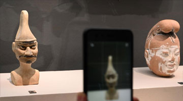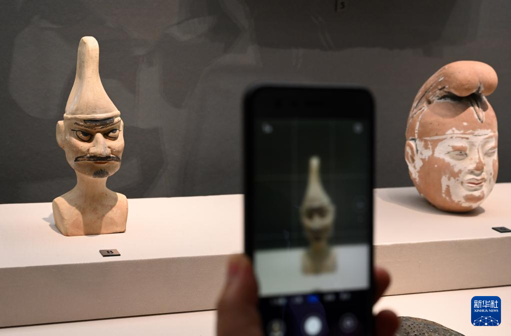 这是展出的彩绘泥塑头俑(6月16日摄)。