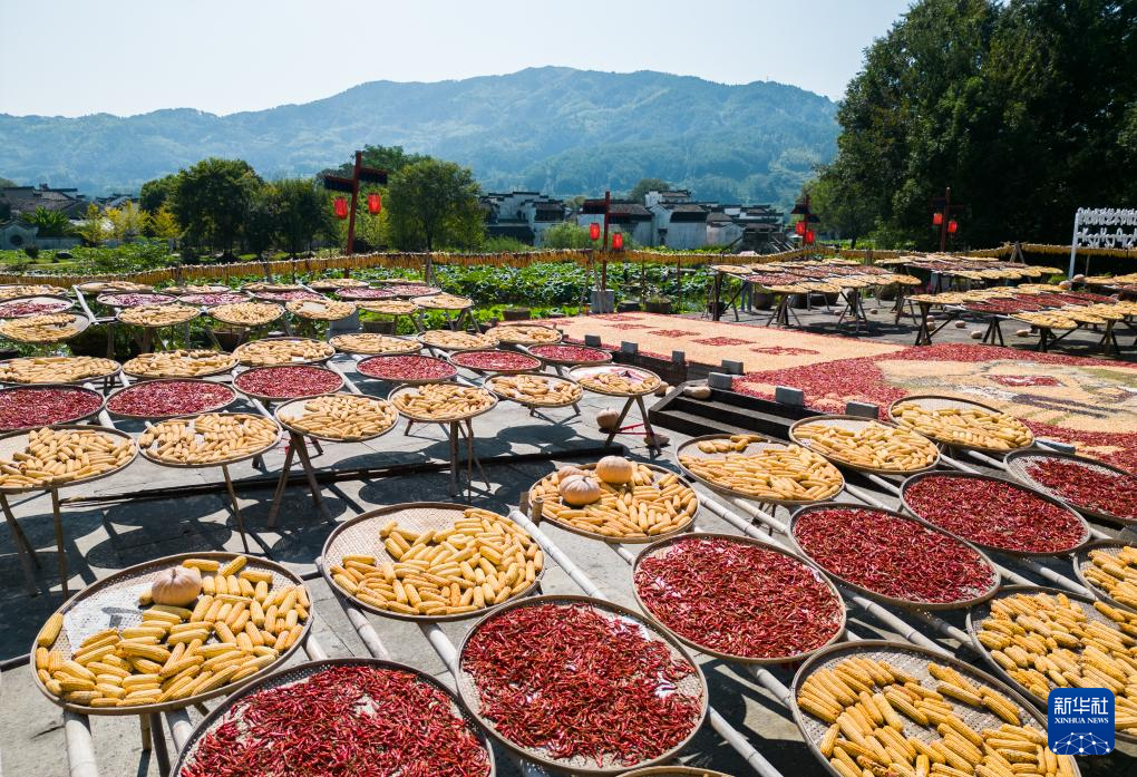 地处皖南山区的安徽省黄山市徽州区呈坎古村自古都有晒秋习俗。近年来,晒秋时节,该村村民会将农作物在村中广场集中晾晒,构成一幅五谷丰登的秋收画卷,吸引不少游客前往观赏,成为当地秋日里的旅游特色。