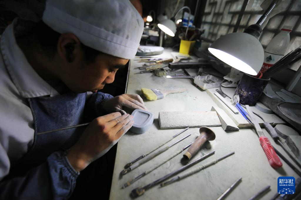 10月24日,艺人在甘肃省定西市临洮县洮砚艺术馆雕刻制作洮砚。