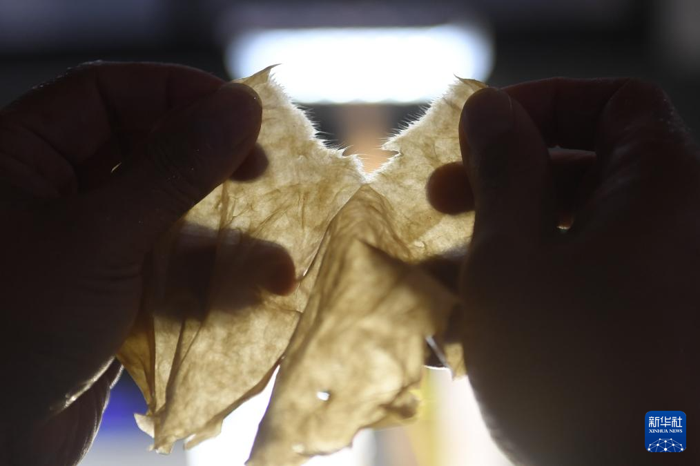 11月9日,工作人员在开化纸传统技艺工坊对修复用纸进行人工除杂。