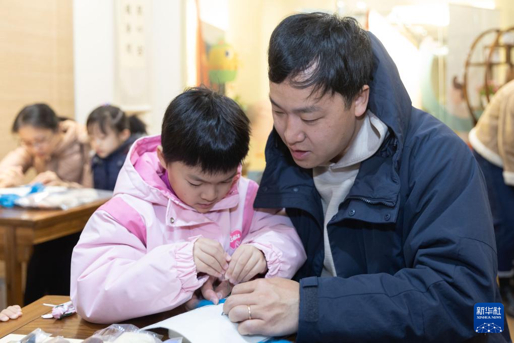 12月23日,家长和孩子在上海博物馆“社会美育大课堂”羊毛毡手工工作坊学习制作缂丝《莲塘乳鸭图》。