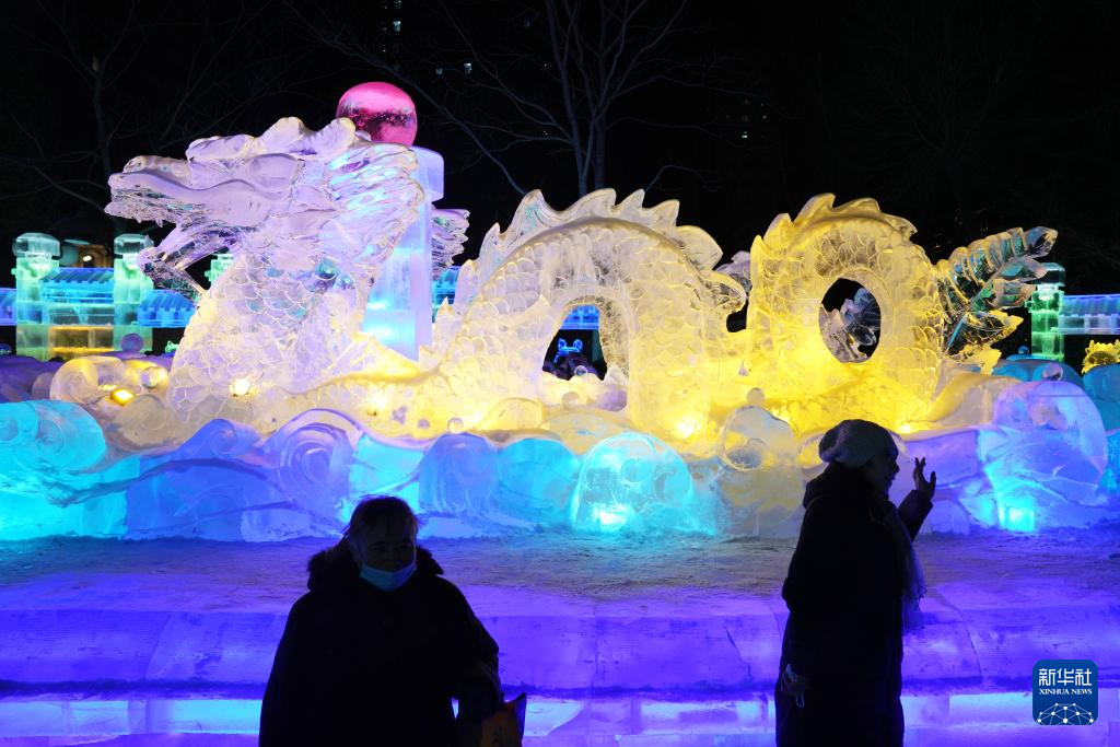 12月31日,游客在哈尔滨冰灯艺术游园会园区内游玩。