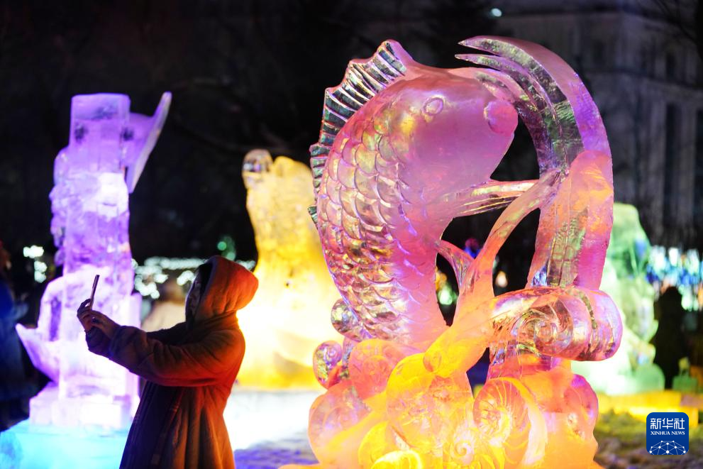 12月31日,游客在哈尔滨冰灯艺术游园会园区内拍照。
