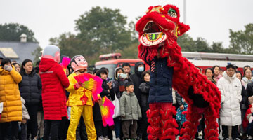 2月22日,刘晶涛(右一)和丈夫谢春波(右二)以及徒弟们在凤城市内的工作室吃午餐。