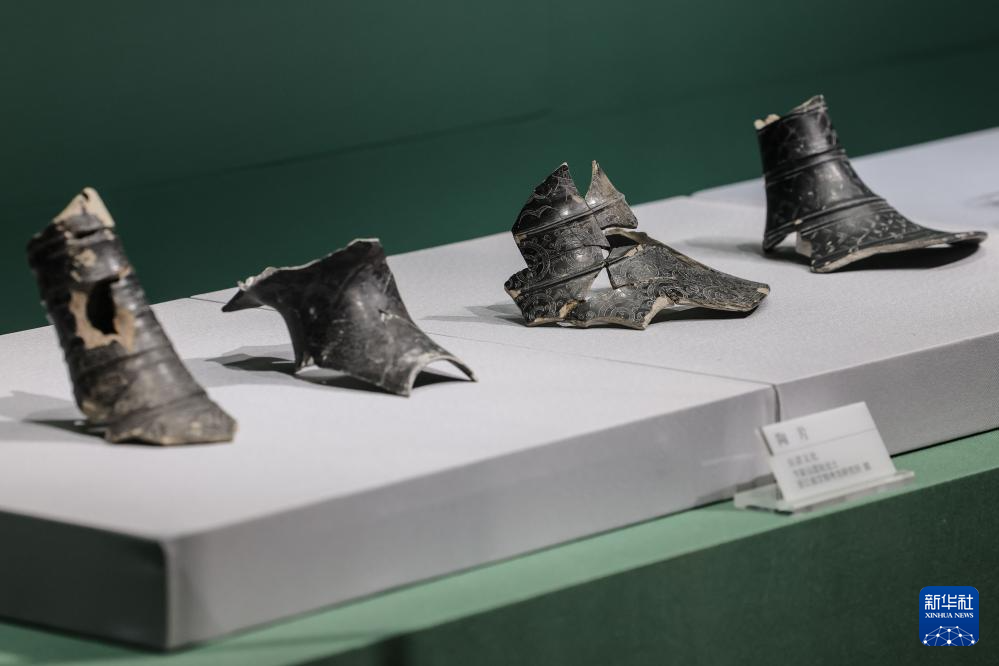 6月8日在“文明之光——红山·良渚与中华文明”主题展览上拍摄的良渚文化陶片。