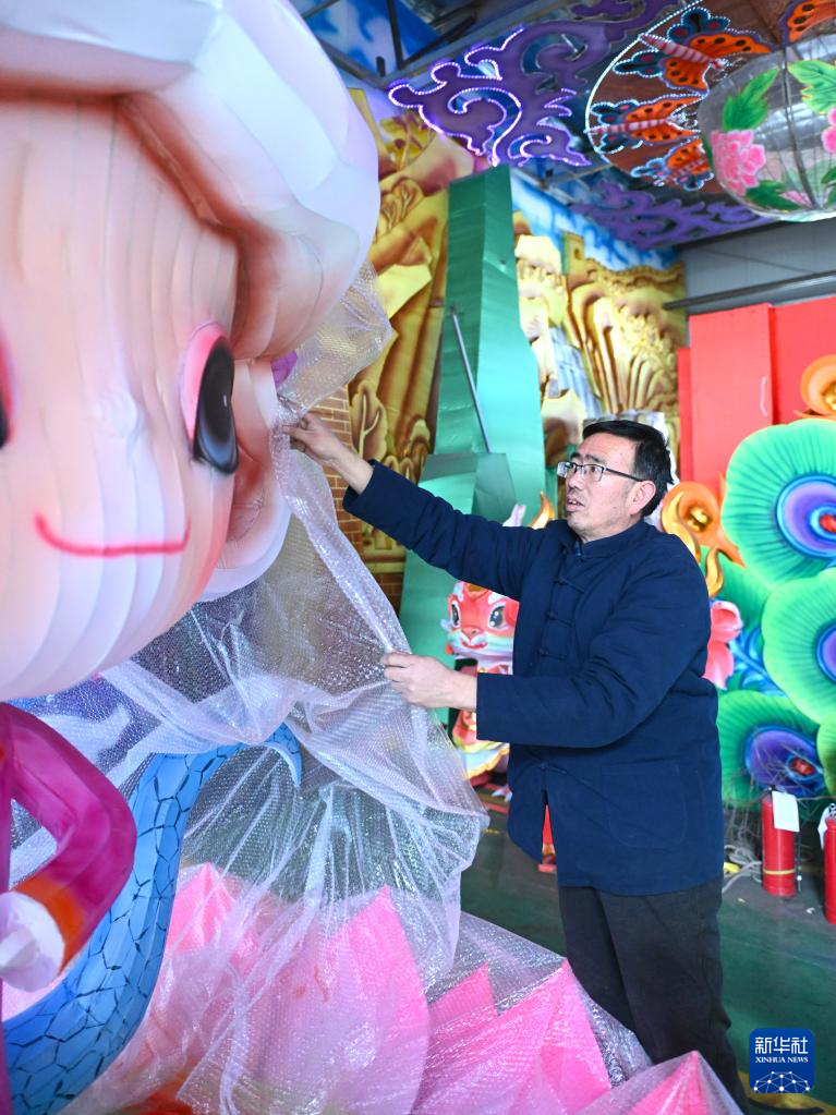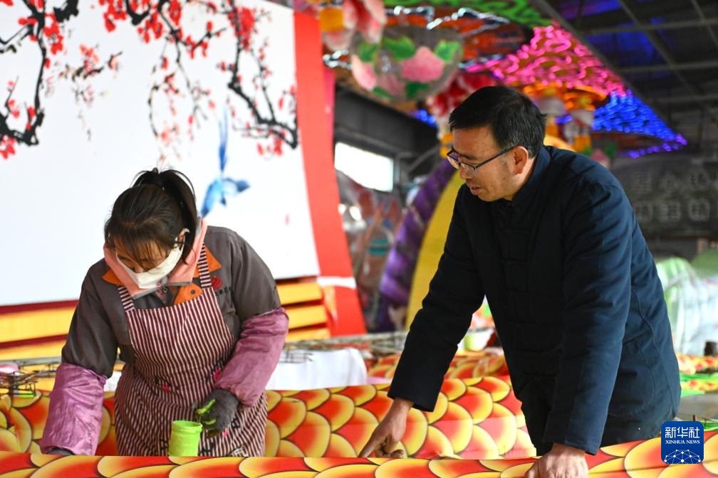 1月8日,苏红章在宁夏固原市隆德花灯传承基地生产车间查看 “蛇”元素花灯。