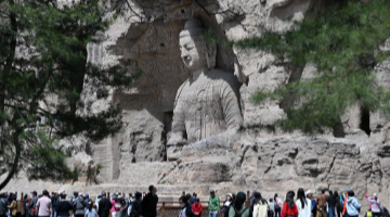 4月28日,观众在青岛电影博物馆外拍照留念。