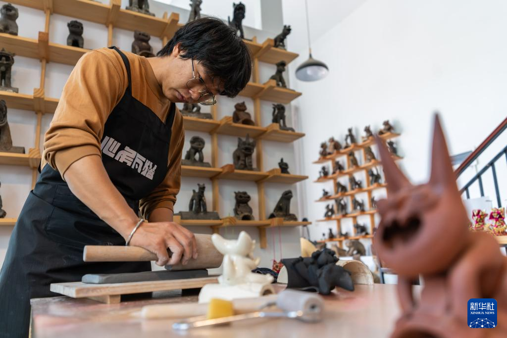 11月7日,张航在“心房瓦猫博物馆”内制作瓦猫。