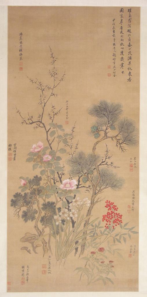 新岁时节,文人雅士提倡清简之美,常以松、竹、梅等供于几案,称之为“岁朝清供”,是年尾岁初,迎春纳福的重要内容。展出的清《杨晋及王翚诸家岁朝图》就寄托着人们对新年的美好愿望,为节日增添了吉祥和瑞的气氛。