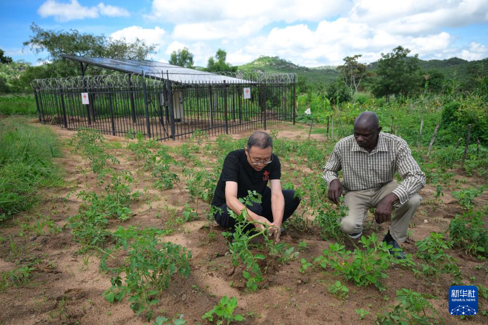 1月26日,在津巴布韦中马绍纳兰省沙姆瓦地区津迪村,村长韦夫森·津迪(右)与中国援津第四期高级农业专家组专家路普政一起查看菜地。新华社记者 杨光 摄