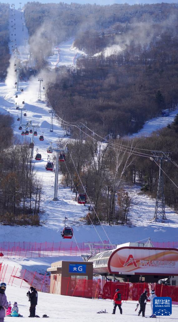 12月2日,在吉林市北大湖滑雪度假区,滑雪爱好者乘坐国产缆车达到山顶(无人机照片)。新华社记者 颜麟蕴 摄