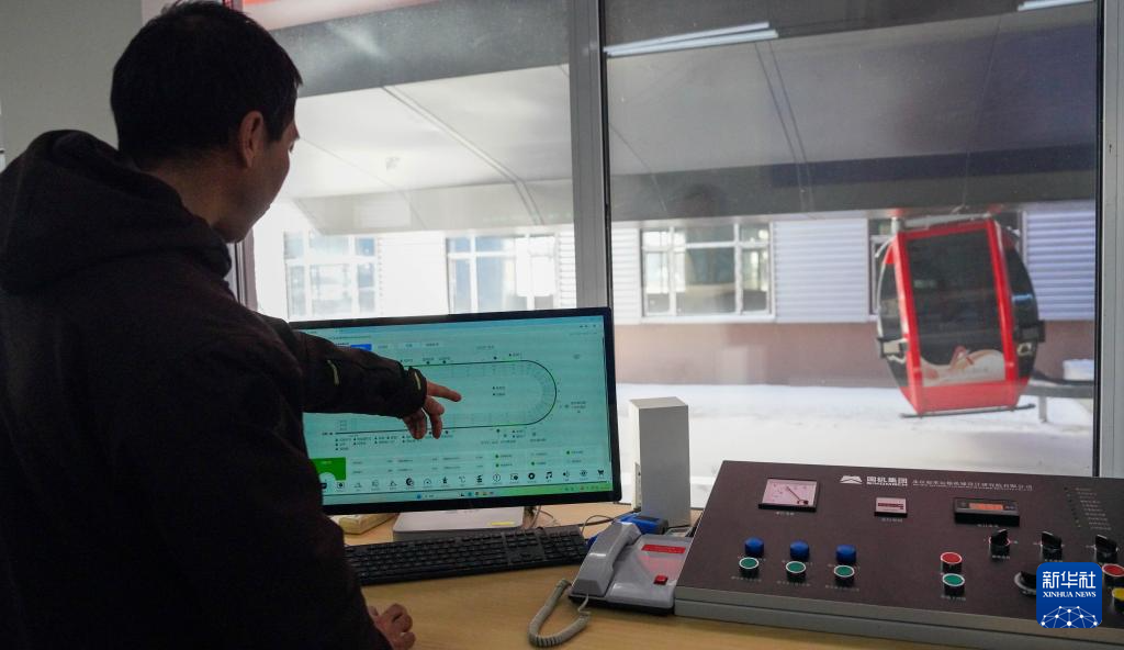 12月2日,在吉林市北大湖滑雪度假区缆车站,工作人员王玉强使用智能化装备监控缆车运行。新华社记者 颜麟蕴 摄